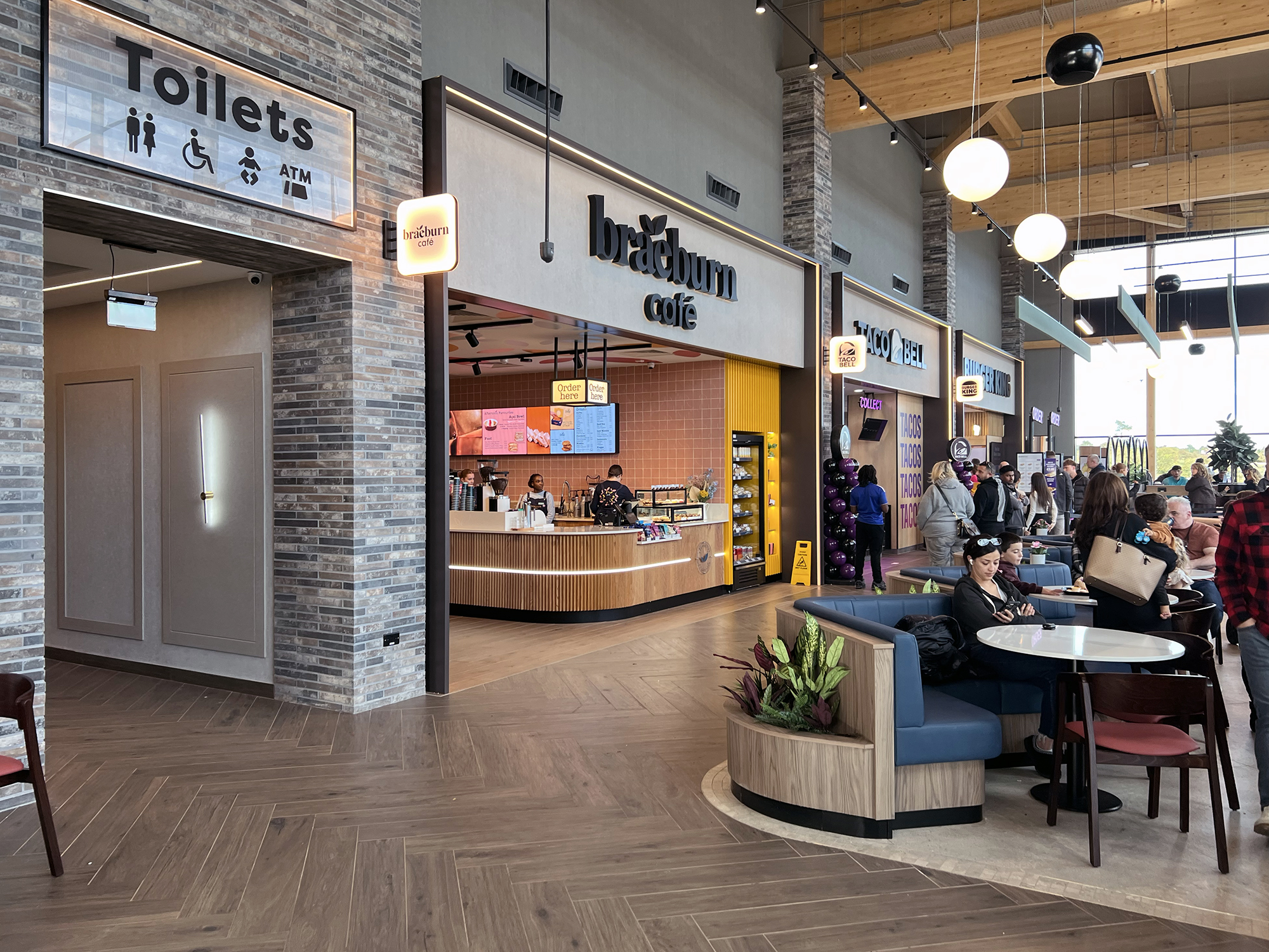 The main food units at Dunshaughlin services, showing the plain branding and fake brickwork to make for a better interior.